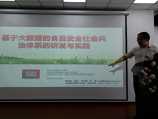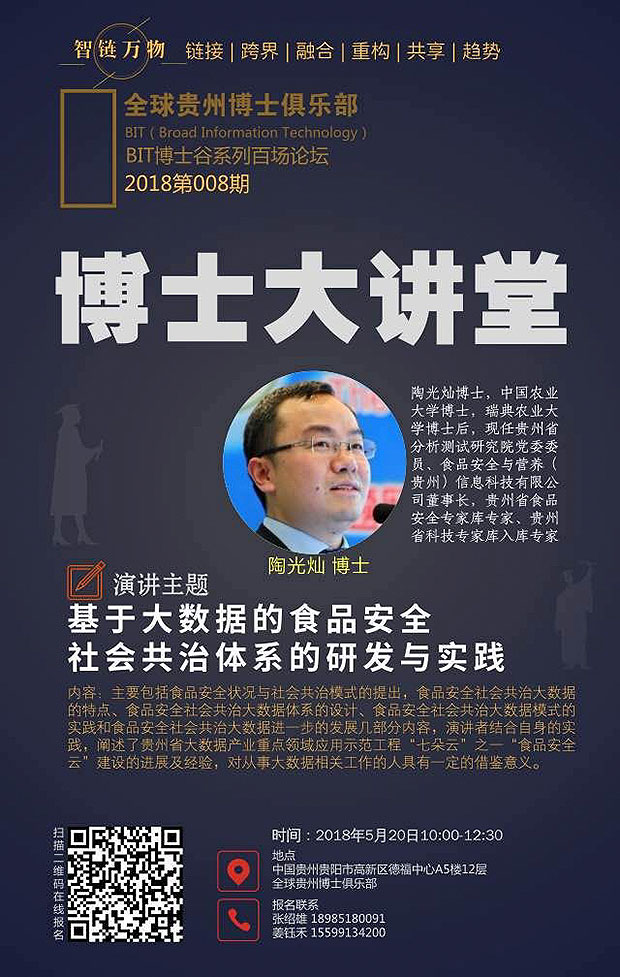 2018年5月20日上午10时,全球贵州博士俱乐部BIT博士谷百场公益演讲第八期:“基于大数据时代的食品安全与社会共治体系研发和实践”公益讲座,在贵阳国家高 新区全球贵州博士俱乐部博士大讲堂里举行。由陶光灿博士主讲。他是中国农业大学博士,瑞典农业大学博士后,现任贵州省分析测试研究院党委委员、食品安全与营养(贵州)信息科技有限公司董事长,贵州省食品安全专家库专家、贵州省科技专家库入库专家。