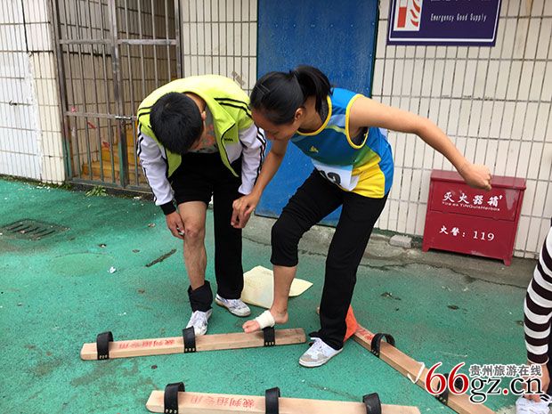 在运动员准备进场比赛时,我看到贵安新区代表队的运动员往脚腕上缠绷带,走近一看脚还肿着,真是轻伤不下火线。听说好些运动员都摔伤过,几个同伴的膝盖上都有伤疤,难怪人们说“比赛10分钟,场下10年功”,要不怎么说体育运动能磨练人的勇敢意志和坚忍不拔的精神呢,竞技运动对于年轻人来说的确具有挑战性。据了解,贵安新区代表队由贵州城市职业学院的少数民族运动员组成,于今年9月才组建蹴球、押伽、板鞋队,相比之下是参赛队中资历最短的 “年轻”队伍,他们希望借此机会向兄弟代表队学习取经。该学院体育学院副院长周慧珍介绍说,该队成立后是利用每天下午课外活动时间训练,国庆节后每天集中训练2次,特别注重对运动员身体素质、心理素质、协调配合、力量爆发、技战术灵活运用等方面的训练,运动员们刻苦认真、顽强拼搏,力争赛出好成绩。