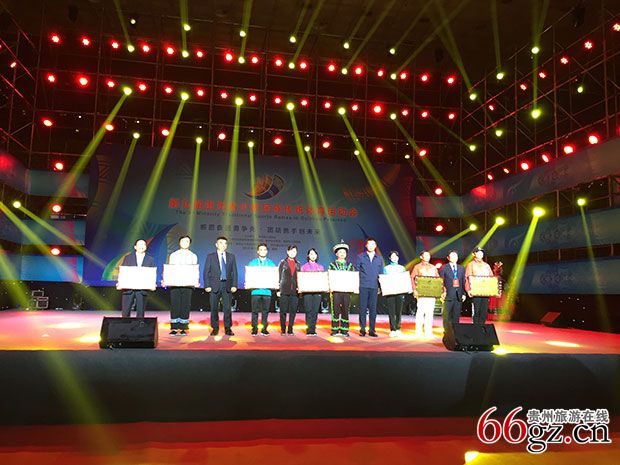 在颁奖仪式进行中,举行了优秀表演项目汇报演出:黔东南“瑶族武术”、毕节“飞笙踏月”、黔南“水族斗角”、贵阳“苗欢苗娅”、开阳县高寨苗乡“苗欢苗娅”、毕节 “彝山之恋”,表演者的民族服饰琳琅满目,歌舞节目美轮美奂 ,赢得观众的阵阵掌声及喝彩……闭幕式在激情热烈的“爱我中华”歌声中结束。