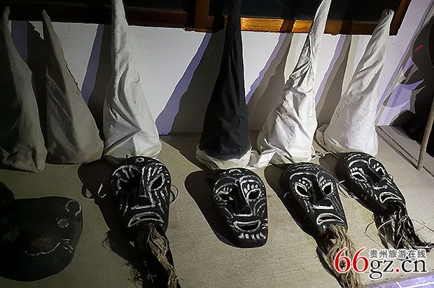 在织金县金龙乡中寨村张应贵(穿青人)坛班,五显坛(庆坛)。是家族传承,至今有五代人。其留存的部分案画和书籍,面具为纸做得六张。对于为何不做木制的,传承人说,以前是有木制的,由于太重,所以在三十年以前,逐渐用纸壳代替。