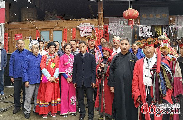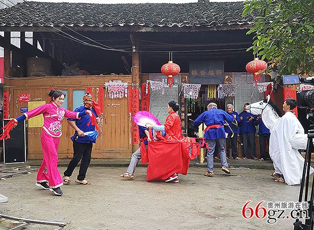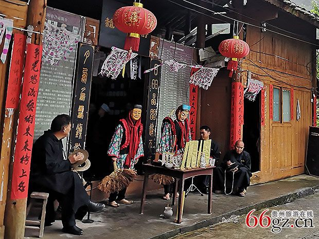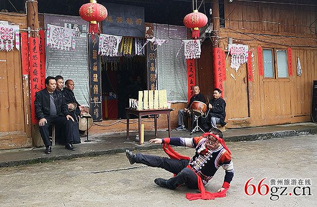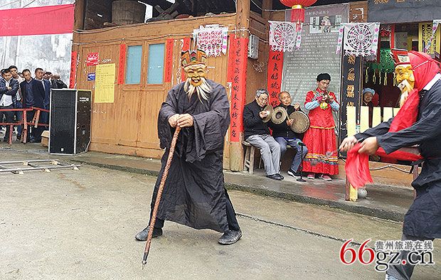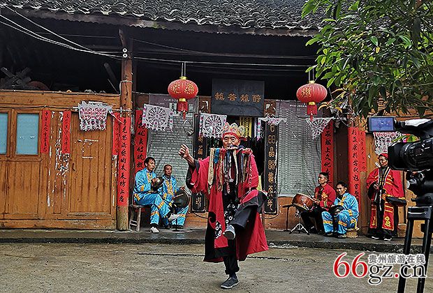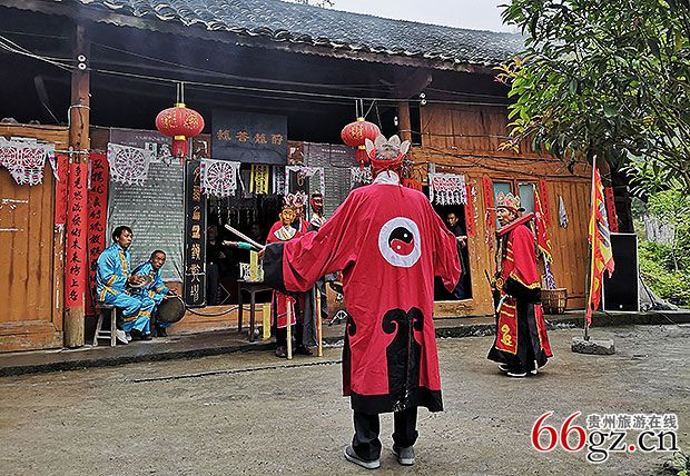 在七百渡村秦法通家的老屋门前 他们因地制宜搭台唱戏,村民们不约而同前来观看他们的演出。这次有5支傩班表演了10多个傩戏节目,周边的九龙村等村寨也来表演献艺,好不热闹。