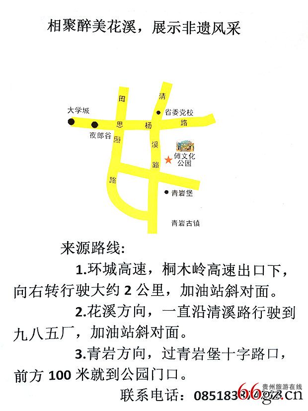 我回信:是花溪傩文化公园和夜郎谷,你可以坐 火车站至青岩的203路公交车,在9855厂站下车,前行90米 有一个加油站的斜对面就到了花溪傩文化公园。