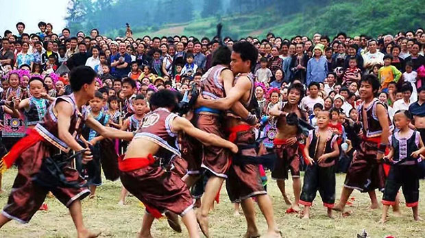 侗族摔跤主要流传于黎平县双江镇,是一种集武术性与娱乐性为一体的体育竞技活动,备受当地群众喜爱,根据这一素材编创的舞蹈摔曾获得第八届,第九届全国少数民族体育运动会表演项目金奖,以及第十四届全国群星奖。
