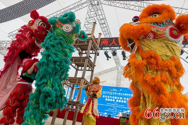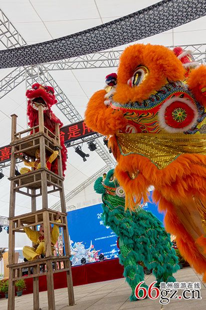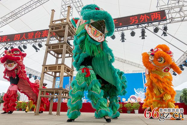 上午10点,非遗传承人首先上演了非遗绝技“高台舞狮”,只见四人登台表演,两个人扮狮子,把狮头狮皮披在身上,只露双脚;另外两人分别装扮成孙悟空和笑脸和尚挥舞手帕,大蒲扇逗引狮子逐层攀上5张八仙桌叠成的高台,高台上的表演惊险绝伦,使人赞叹不已,赢得观众阵阵掌声,为活动开了一个好彩头。