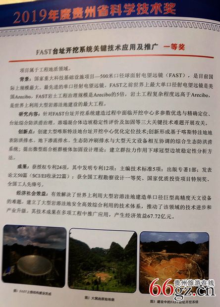 2019年度共评出贵州省科学技术奖111项,奖励的科技成果,是对科技创新支撑高质量发展、改善民生福祉等方面发挥重要作用的生动描绘,集中反映了贵州科技创新工作聚焦同步小康、聚焦重大需求、聚焦国民经济主战场。在聚焦重大科技需求方面,省科技进步奖一等奖获奖项目“FAST台址开挖系统关键技术应用及推广”,针对目前国际上规模最大、最先进的单口径射电望远镜—500米口径球面射电望远镜(FAST)台址开挖系统建造过程中面临开挖中心多参数优选与精确定位、台址综合防洪涝治理、溶塌混合体边坡稳定性评价及加固等三大关键技术难题,由贵州企业牵头,联合国家院所、知名高校历时7年进行关键技术创新,有效解决了利用大型岩溶洼地建造大型科技基础设施的难题。