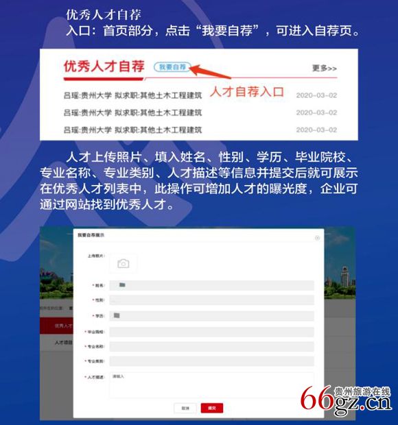 @全球精英,来做“贵人”——第九届线上线下贵州人博会手机就能投简历,即登录贵州人才博览会官网(http://rc.guizhou.gov.cn/)或“贵州人才博览会”微信小程序,在首页的“优秀人才自荐”和“人才项目自荐”中点击“我要自荐”,根据提示填写个人信息资料并提交后,便可展示在优秀人才列表中。同时还可通过贵州人才博览会官网中的“引才专区”“市州专区”“事业单位绿色通道”“企业招聘信息”等栏目查看人才需求,点击职位名称即可了解职位详情及企业相关信息。人才简历完善度达到70%,方可投递简历。投递简历后可选择与单位联系了解更多岗位信息,然后可持续关注“个人中心——我的投递”与“个人中心——我的面试”模块,单位对简历审核后,将结果显示在这两个模块中,包括资格初审结果与面试邀请通知等。