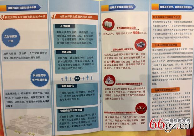 《规划》明确六方面的重点任务:一是构建支撑经济社会发展的科技创新技术体系。围绕“四新”主攻“四化”,构建农业农村、新型工业化、服务业创新发展、民生改善的技术支撑体系,明确农业、工业、服务业、社会民生改善等领域科技创新主攻方向,增强高质量科技供给,支撑引领新型工业化、新型城镇化、农业现代化、旅游产业化发展和乡村振兴、大数据、大生态三大战略行动的实施;二是夯实科技创新基础。培育壮大科技型企业集群,引导企业加大研发投入,提升企业技术创新能力。加强高校创新能力建设,加快科研机构创新发展,加快发展新型研发机构,增强科技创新和成果转化能力,进一步发挥高校、科研院所在科技创新中的骨干和生力军作用。加强科技人才队伍建设,完善科技人才发现、培养、引进、使用和激励的政策体系,优化科技人才发展环境,充分激发科技人才的创新活力与潜力。加强创新平台建设,推进各类科技创新基地优化整合,加快推进黔灵实验室、贵州科学数据中心等重大科技基础设施和重点实验室为引领的高水平创新平台建设。推动高新区高质量发展,争取2025年国家高新区数量翻一番;三是推进全方位开放创新。立足各市(州)创新资源禀赋和产业发展基础,优化区域创新布局,加强区域创新联动发展,形成各具特色和优势的创新发展格局。积极融入全球科技创新网络,主动融入国内区域创新、协同创新,加强部省、院省深度合作,形成全方位开放创新格局;四是推动科技创新成果转化。完善科技成果转移转化机制,强化科技成果转化市场化服务,健全技术转移组织体系,完善创新创业孵化体系,提升科技成果转化效率。积极拓展科技与金融融合途径,完善科技与金融结合机制,从科技信贷、创业投资、创新科技金融产品和服务等多方面,促进科技创新和现代金融深度融合;五是深化科技体制机制改革。改革科技计划管理,优化科技计划布局,建立健全关键技术攻关和应急机制,推动政府职能从研发管理向创新服务转变。改革完善创新评价、科技奖励、创新调查和统计监测、科技报告等制度,深化科技成果收益改革,加强科研诚信建设,加强知识产权保护与运用,形成有利于创新发展的生态环境;六是营造良好创新环境。大力弘扬科学家精神,全面提升科学素养,营造激励创新的社会文化,形成尊重人才、尊重创造、鼓励创新、宽容失败的创新氛围,汇聚科技创新发展的磅礴力量。