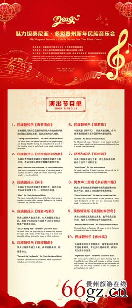 经过两个月的精心策划和编排,主办单位与省民族乐团、省民族管弦乐团,合力打造一台具有浓郁贵州民族特色的音乐会,通过10组精心筹备和排练的乐曲,为坦桑尼亚观众们呈现一场具有高水平、高质量、高标准的音乐盛宴,展示多彩贵州的人文之美、自然之美、生态之美。演出曲目中有独具贵州民族特色的《嘎老·吃新》《瑶族舞曲》等,有饱含中华文化精粹的《春节序曲》《茉莉花》,有满载坦桑尼亚风情的《美丽的奔巴岛》,展现出贵州儿女喜邀各方来客庆新年的热情与活力。与此同时,展现贵州多彩的民族文化和丰富的旅游资源,进一步拉近坦桑尼亚与中国贵州人民之间的距离。实施好这一项目对于2022年部省对口年度合作计划开好头、起好步,加强和拓展对外交流与合作,面向海外传播中国优秀传统文化等具有重要意义。