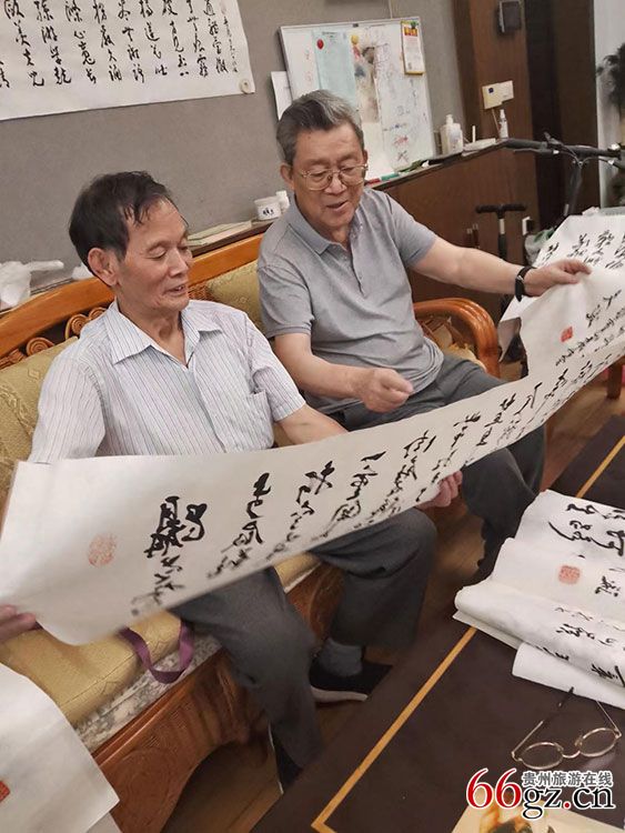 田光华先生在自己家里的"菲丁文化室"挥毫书法。贵阳晚报记者 摄