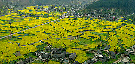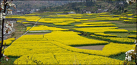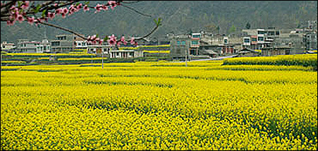 近日,贵州省梵净山一带木黄风景名胜区旅游线上,遍地的油菜花竞相开放。金黄色的油菜花将这里的村寨融入其间,形成一座座金黄色的农庄,成为梵净山春季旅游热点。