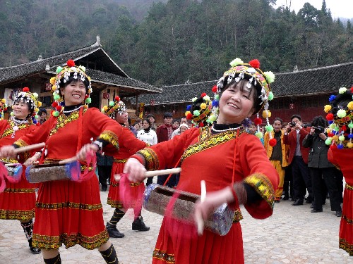 2月25日,在石阡县坪山乡尧上仡佬族文化村举行的敬雀节上,仡佬族妇女表演“仡佬嘣嘣鼓”。