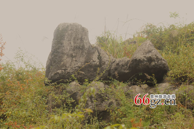 官靴:裸露石芽,高0.5,底座宽1m左右,石芽上下部分之间有明显裂隙,呈水平状分离,经长年累月的流水溶蚀、冲蚀而成,表面有溶痕、溶沟发育。石芽上部,后高前低,俨然一只古代官靴。