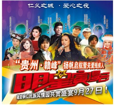 由黄绮珊、郑源、野马、安又琪、陈星、乌兰图雅、中国兄弟组成强大明星阵容的“仁义之城.爱心之夜”关爱残疾人演唱会。将于9月27日在贵州铜仁民族风情园激情开唱。