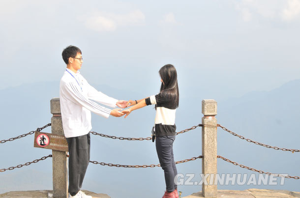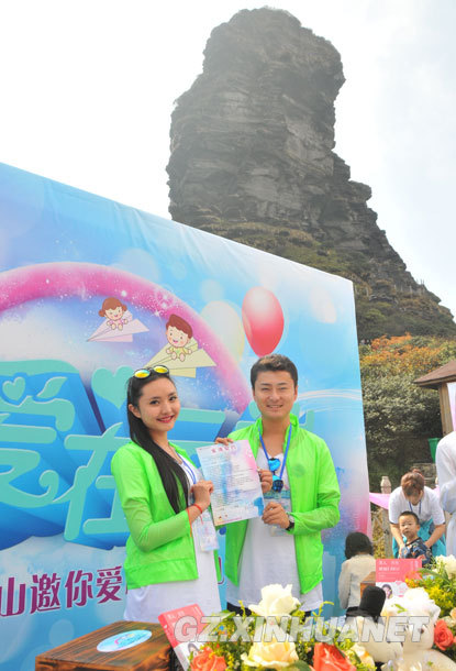 10月25日,来自贵州的夫妻景伟健(右)与顿夏夏在梵净山景区签署“爱情契约”。