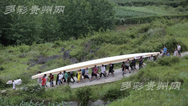 20多名壮汉扛起重达600斤的玻璃钢龙舟,翻山越岭抬到村里。