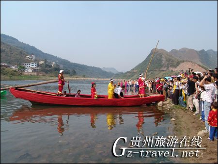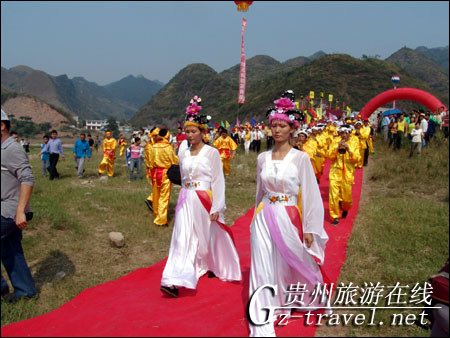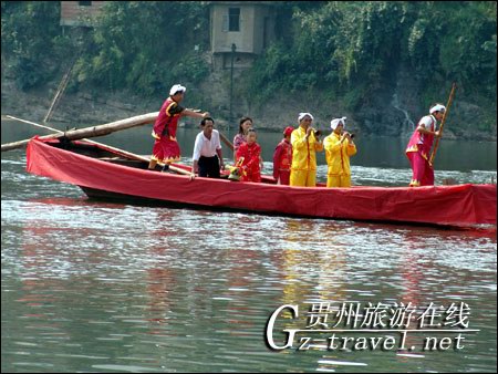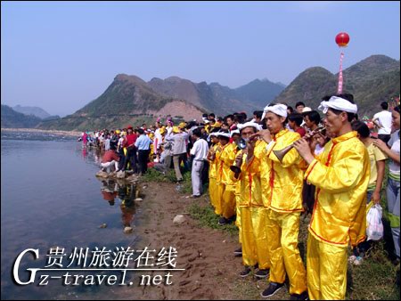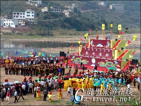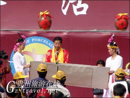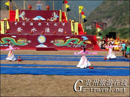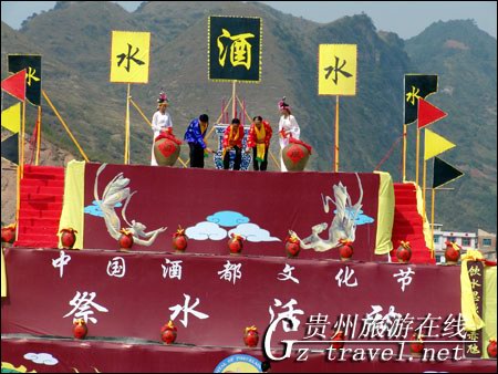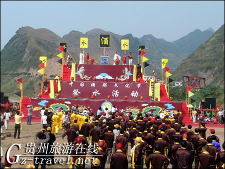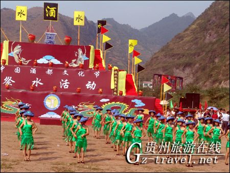 在金鼓和唢呐声中,挂满红绸的小舟,载着童男童女划到江心,童男童女各用陶罐从江心取出清水。船划回岸边,由神女领着走到神坛,童男童女将取来的清水倒入祭坛中,在鼓乐声中主祭人和陪祭人向天地鞠躬、敬香、敬酒,然后由市政协主席王德碧恭读祭文,由茅台酒厂集团公司副总经理丁德杭和酒中酒厂总经理曹本强焚烧帛书。紧接着由1400人组成的秧歌队、腰鼓队、威风锣鼓队、唢呐队、舞龙队等进行了文艺表演。整个活动有声有色,秩序井然,赢得了参与者的一致好评。