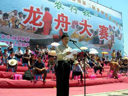 湄潭县县长鞠洪在龙舟大赛上致辞