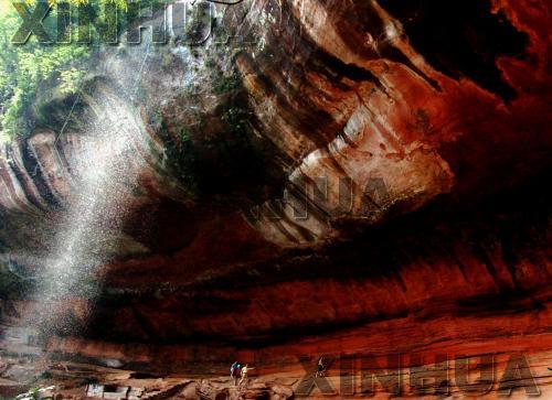 游客在贵州赤水杨家岩景区参观丹霞地貌