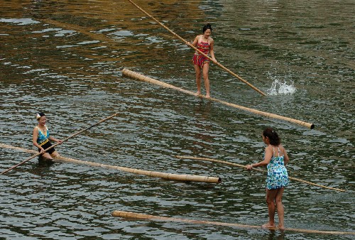 9月13日,几位市民在遵义市中心的湘江河中练习独竹竞渡。 独竹竞渡是贵州省遵义地区一项濒临失传的传统绝技,操作者赤脚踩着一根长6米左右的粗大楠竹,用一根细竹竿为桨横渡江河。曾是当地人交通工具之一的独竹竞渡,如今成了人们时尚的健身娱乐项目。