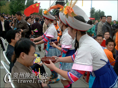 仁怀市后山乡少数民族姑娘为来宾敬上美酒