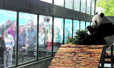开馆仪式后,游客随即蜂拥而入。此时,盼盼正在桥形木架上吃竹叶,看到一下子来了这么多人,它显得很兴奋,一屁股坐在桥上,两前掌悬空,摆了个造型。之后,它下桥来到浴池边,为大家表演起了“熊猫戏水”。
