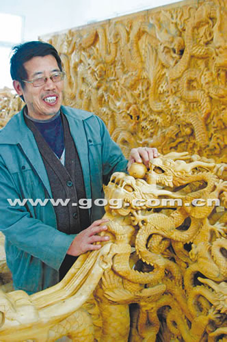 他说,龙椅靠背是工艺最复杂的部分:若干条龙在靠背上环绕穿梭,相互交叠组成三层,而且每条龙嘴里均含有可滚动的“龙珠”,仅这两个靠背,他就花费了3000多个工时。