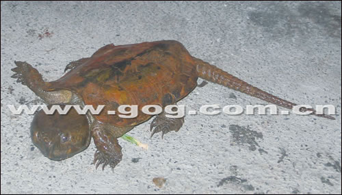 据介绍,这只平胸龟是该县龙泉镇文峰村村民陈世强的孩子5月9日在县城近郊龙潭河边玩耍时发现的。这只乌龟头呈三角形,眼睛酷似猫头鹰,尾巴覆盖鳞甲,其头部、四肢都不能缩入腹甲,与平常的乌龟相差甚远。孩子看到后很好奇,遂带回家中。陈世强见后,于是请来凤冈县林业局工作人员进行辨认。这才发现,这是一只罕见的平胸龟。5月12日,陈世强与林业部门工作人员一道将这只平胸龟放归大自然。