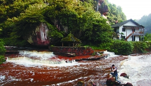 据介绍,“楠木水”是三岔河里的特色,即便不下雨,部分河段的水色也是如此。据了解,这里的河水呈酱色,除河底丹霞石映衬外,主要原因是雨水经几十厘米厚的森林腐殖层过滤渗出时,夹带了一些矿物质。