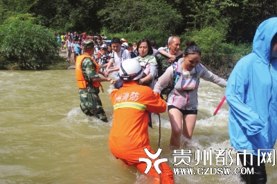 8月16日,遵义多地暴雨,绥阳县观音岩景区,100余名游客被洪水挡住退路,县消防官兵经过9个小时救援,游客转危为安。