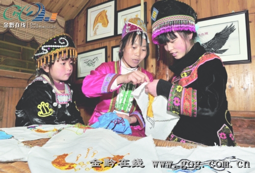 李开会(中)在教孩子们仡佬族手工刺绣手艺