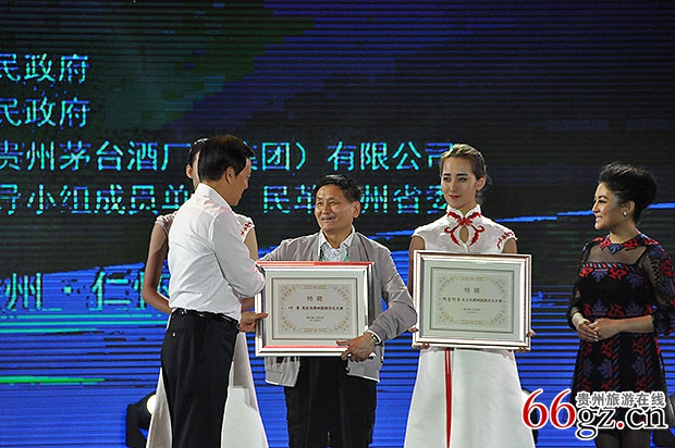 贵州省委书记陈敏尔为贵州旅游文化大使叶辛、阿鲁阿卓颁发证书。