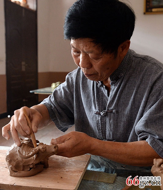 余庆县今年65岁的民间泥塑艺人,是遵义市市级非遗传承人,年幼就喜欢跟着父亲用家乡的泥巴捏各种各样的泥塑。随着年龄的增长,颇有悟性的黄泽富偏爱起用双手捏各种各样的水牛。为将水牛的捏得传神,黄泽富只要一有空就去田间观察牛的习性,有时痴迷到了废寝忘食的地步。