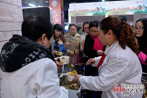 整个活动现场,最热闹的莫过于特产美食展示展销区域,各种琳琅满目的务川特产:茶叶、地牯牛、冰糖大蒜、酥食、麻饼、豆腐干......在大家一一品尝之后,许多观众掏出腰包,争相购买。而务川小吃:豆浆粉、羊肉粉、蕨粑、蕨包子让现场飘香四溢,牛肉粉店的门口甚至还排起了长龙。