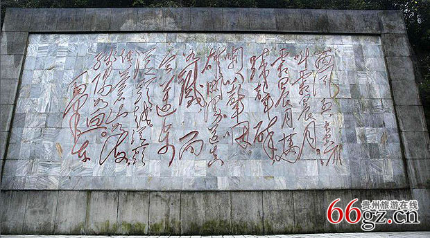 关口东侧山崖,建有主席《忆秦娥·娄山关》诗词手迹的石碑。该石碑建于1973年,全长25米,象征红军2万5千里长征,通高13.55米。石碑由396块云南大理石镶嵌而成,最大的字有3米多高,娇若游龙,惊似飞鸿,巍峨壮美,气势非凡。