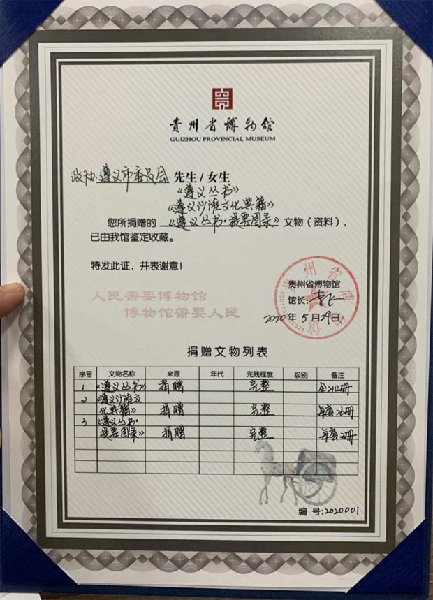 2020年5月29日上午,遵义市政协向贵州省博物馆捐赠《遵义丛书》仪式在馆B401会议室举行。此次捐赠的珍贵书籍有《遵义丛书》(210册),《遵义丛书·提要目录》(2册),以及《遵义沙滩文化典籍丛书》(内含郑珍、莫友芝、黎庶昌全集共26册)各一套。