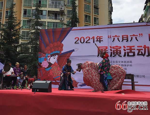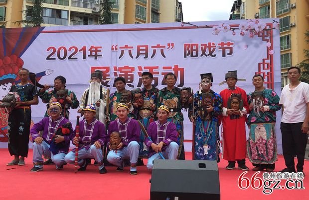 “黎氏阳戏”源于一个美丽的故事,相传唐王李世民为了救治身患重病、双目失明的母亲,下榜征集良医能人。李世民慧眼识珠,赐予应征的王姓乞丐一顶瓜皮帽和一根玉竹杖。乞丐用玉竹杖画个太阳放在唐母床前,要李世民按照特定方式做法事,唐母果然双目复明、疾病痊愈。此神话色彩的法事因王姓乞丐所画太阳而被称为“阳戏”,寄托着人们的美好愿望,在民间流传开来。多年后祖籍江西的黎氏祖先黎法显带着“阳戏”迁至贵州遵义沙滩,其后代在富家坪定居,黎家人遵循先辈遗言,代代口传形成“黎氏阳戏”。其传统剧目有《天官排朝》《迎请诸神降临》《李二郎登殿亲领红猪》《夫妻渐行》、《私配凡夫》等,演出分上圆台、中圆台和下圆台。演员全是男性,需“净身”、着戏装、戴面具、涂花脸,手持道具登场,角色分生、旦、净、末、丑等,戏中女角为男扮女装。其唱腔有9板14腔,根据人物、剧情、角色来定音。表白采用方言,表演中将地方傩戏、花灯、民间歌舞的手法、步伐、眼法、身段,及穿针引线、砍柴割草、收谷采茶等乡土生活元素融为一体,形象地表达喜、怒、哀、乐、悲、恐、惊等情感,颇具艺术审美价值。“黎氏阳戏”具有浓郁的地方特色,剧目扬善惩恶、庆五谷丰登、颂平安吉祥,曾于1990年参加过全省首届民族民间艺术节演出,赢得良好声誉。