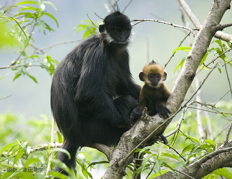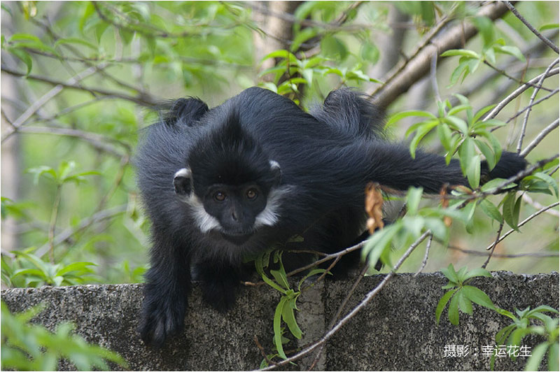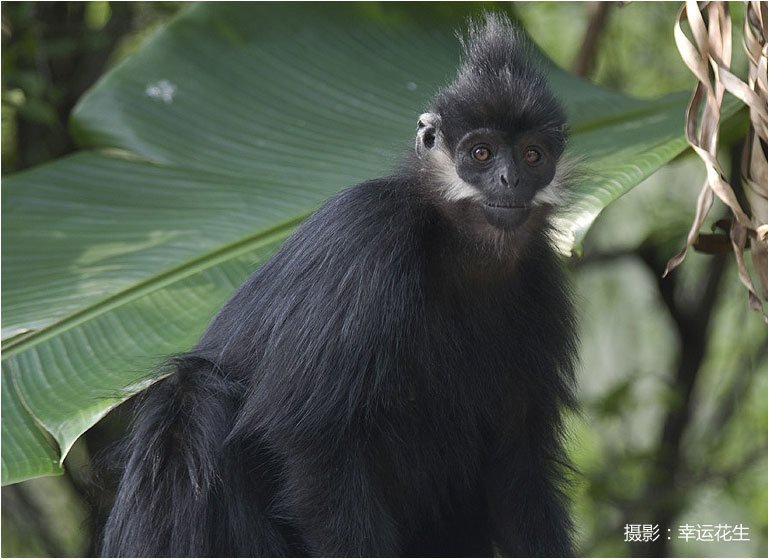黑叶猴别名乌猿,国家一级保护动物,生活于热带、亚热带丛林中,树栖,喜群居,每群有一首领带领猴群活动。其体形纤瘦,四肢细长,头小尾巴长,体长5060厘米,尾长7986厘米。头顶有黑色直立的毛冠,两颊至耳基部有白毛,成体全身乌黑色;体毛长而厚密,有光泽。手、足皆乌黑扁平指(趾)甲;尾尖端白色。刚出生的小黑叶猴,全身乳黄色,头部则为金黄色,尾为黑色,30天左右全身变黑,但头部还是金黄色。