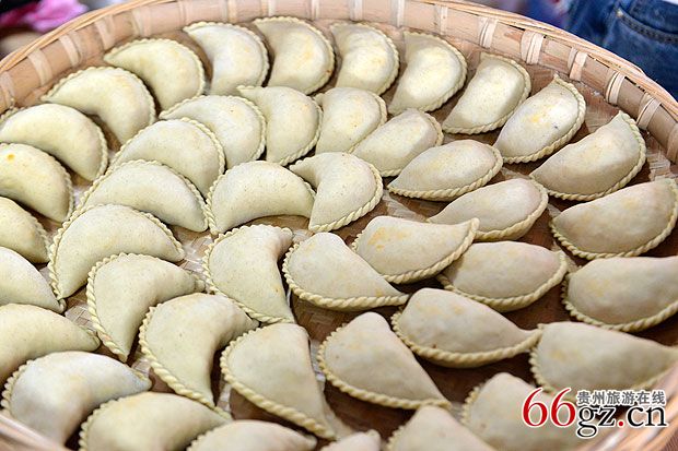 制作商时,将荞面和水做成面皮,切割成约35-45厘米大小的圆形状。然后把切成丁的威宁火腿、竹笋、豆腐、腌菜、葱姜蒜等用油炒好做成馅。