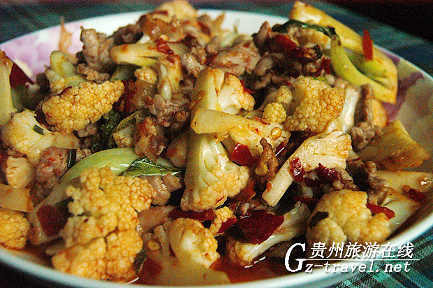 3、锅中留少许食用油,倒入糟辣椒炒至有香味溢出,再将肉片倒入锅中翻炒,待肉片7-8成熟后,把花菜也倒入一起炒