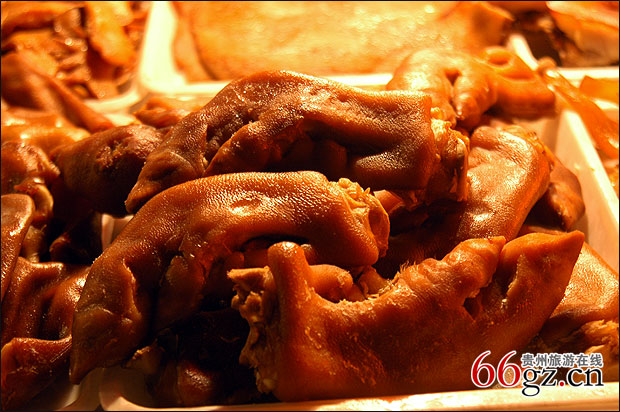 卤猪脚,又名状元蹄。是贵阳南郊青岩古镇的特色食品之一,相传在清朝时期,青岩赵以炯,为了上京赶考,常温功课到深夜。有一天,突然觉得肚子饿了,便走到北门街一夜市食摊,点了两盘卤猪脚作消夜,吃后对其味赞不绝口。摊主上前说:“贺喜少爷”。赵问:“何来之喜?”。摊主不失时机的说道:“少爷,您吃了这猪脚,一定能金榜题名的,‘蹄'与‘题'是同音,好兆头,好兆头啊。”赵听后大笑,不以为然。不日,他上京赴考,果真金榜题名,高中了状元。回家祭祖之时,重礼相谢摊主。此后,卤猪脚便被誉名为“状元蹄”。经历代家厨相传,扩至民间至今。