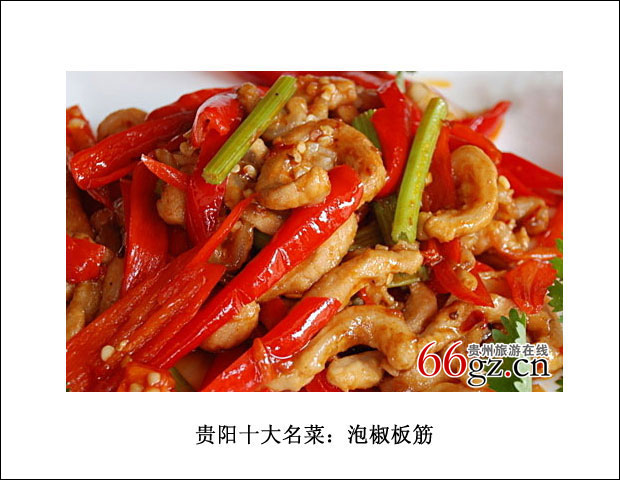 泡椒板筋,是用选用特色调味品泡椒来烹调猪板筋,是一道非常典型的黔菜,具有咸鲜、微辣的味型特点。泡椒板筋必须选用新鲜大猪通脊肉内筋(当地又称背柳肉)为主料,在烹饪前进行腌制,配以酸、辣适中的泡椒作为辅料。在烹饪时讲究现切、现腌、现炒这三大原则。色泽红亮,酸辣爽口,滑脆鲜嫩。但炒出来的泡椒板筋的板筋光嫩是不行的,还要糯香。泡椒也必须是软中带脆,并且菜肴还是清质亮油,装盘后有形、有色、有味,此为贵阳独有选料方法烹制的特色菜肴。