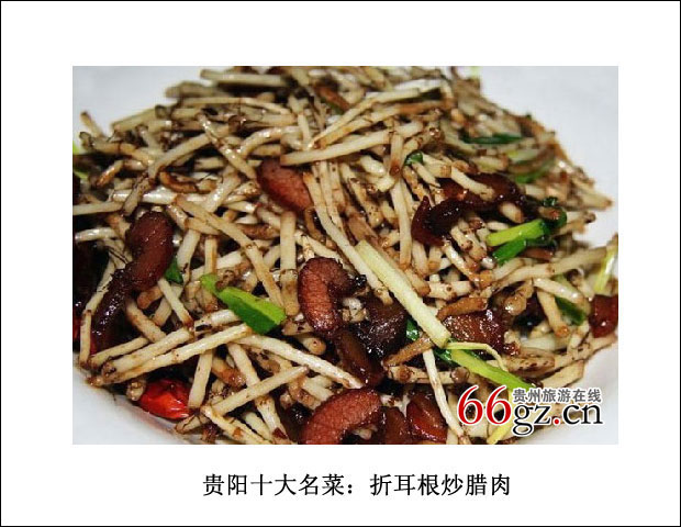 折耳根,学名鱼腥草。因鲜嫩的折耳根有鱼的腥味和少量的中药味道,令许多外地来的客人欲食还休。其实,折耳根对于贵阳人来说,是家家户户非常喜爱的蔬菜,连小孩都特别爱吃。具有解热、消炎、顺气的奇特效果,对皮肤病和消肿也有特效。细长的浅白色茎状物,吃起来粉粉的,炒熟了以后腥味没那么重。腊肉是贵州土法腌制的腊肉,肉色明显比市面上看到的更深,尤其是边缘较硬的一圈。这道菜腊肉烟香爽口,折耳根嫩脆,香葱异香。