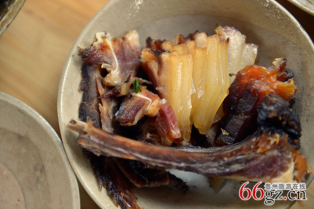一般像城市或很多地方的腊肉,是用太阳晒干或者晾干而成,而苗族烟熏腊肉,原材料是用自己喂养的猪,将猪肉切成大块状,抹上盐和酒,挂在做饭的灶炉上方,然后用自家做饭的柴火烟慢慢的把肉熏好。在此之间,火不能太大,必须由细火发出的烟,慢慢熏烤而成,一般苗族腊肉从备料到可食用前后需要一个月的时间进行腌制,熏制等工序,制作繁琐,备耗劳力,所以熏好的腊肉,肥不腻口,透明发亮,色泽鲜艳,吃起来有种独特的醇香,保持了色、香、味、形俱佳的特点,而且具有开胃、去寒、消食等功能。