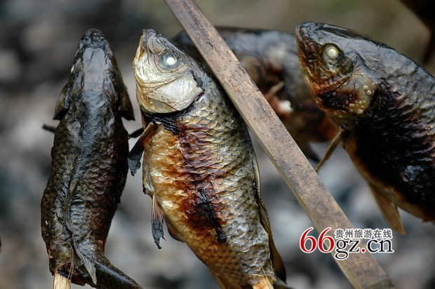 吃烧鱼也有许多讲究,先是将鲤鱼洗净,不去鱼鳞,用竹签或木签串好,在炭火上慢慢烘烤至焦黄熟透,然后将鱼取下,拎着鱼尾,用筷子或手将鱼头和鱼肉剥下,剩下的鱼刺再放到炭火上烘烤至焦黄。烧鱼做好后,接着准备佐料。吃烧鱼的佐料十分丰富,有薄荷、鱼腥草叶、苦蒿、茗国菜、鱼蓼、生姜、大蒜、盐、酱油、辣椒等和烧鱼拌合在一起,就成了一道香辣适中、味美可口的侗族烧鱼美食。