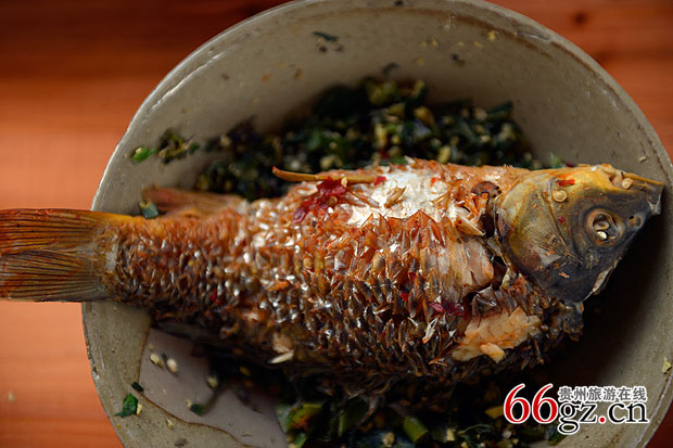 2,青辣椒鱼。做法:将青辣椒用火烤熟,配以姜、大蒜瓣、鱼蓼、吴茱萸籽、木桨油(山苍子油)、盐等佐料制成调料盛于碗中,再将用糍粑辣椒煎好的鲤鱼放在上面,食用时,将鱼刺剔除,再将鲤鱼与青辣椒拌合即可食用,香辣可口,味蕾大开。