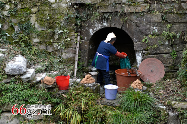 20151219在榕江大利侗寨的古井边看见侗族老人正在忙碌,打听是做水芋粉。语言不通,没有问到详细的制作方法,见她把捣碎的水芋放在编织袋中反复用水冲洗,沉淀出淀粉,但不知道捣碎前是否需要煮熟水芋。