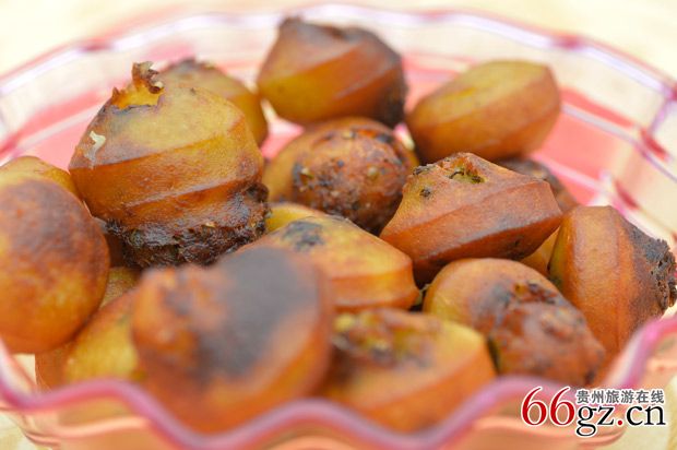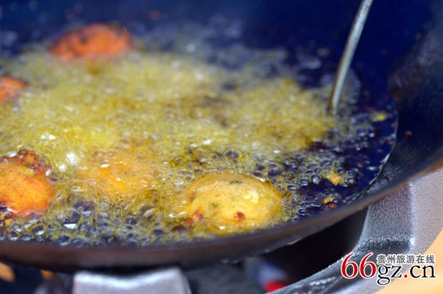 在剑河县常常会看到有小小的油炸粑卖,1块钱三个,用竹签串着。县城十一号区菜场小菜区宋政英家的油炸粑在这小有名气。老板已经五十多岁,很多人都是吃她的油炸粑长大的,吃上一口满满的都是儿时记忆。