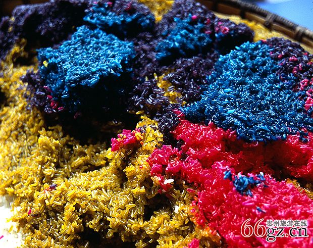 姊妹饭是苗族姊妹节中最为重要的标志。传统的姊妹饭有黄色、黑色和白色。随着旅游的快速发展,苗家人为了更好地宣传苗族姊妹节,在姊妹饭中增加了蓝色和红色两种颜色。