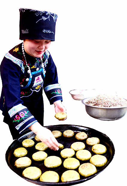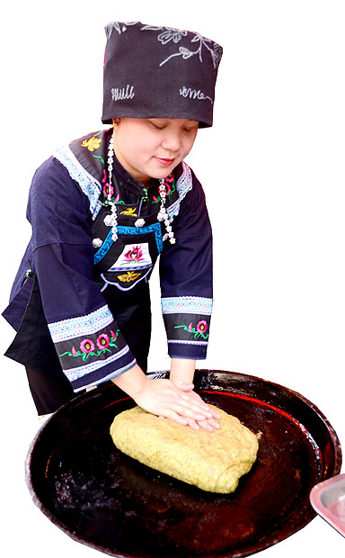 她把清明粑作为旅游产品来打造,用料上讲究,用上好的糯米面作主料,馅料也选用布依传统的原材料,并依据顾客的饮食习惯,制做了三种不同风味的清明粑。