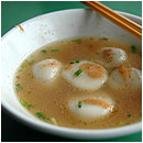 制作方法:先将鸡煮熟,剔下肉切成沫,放入盐、糊椒、淀粉拌匀后挤成小丸子备用。将糯米面加水合好包上鸡肉丸子,下锅煮熟。浇上鸡汤,洒上葱花,淋上花生芝麻酱及可。